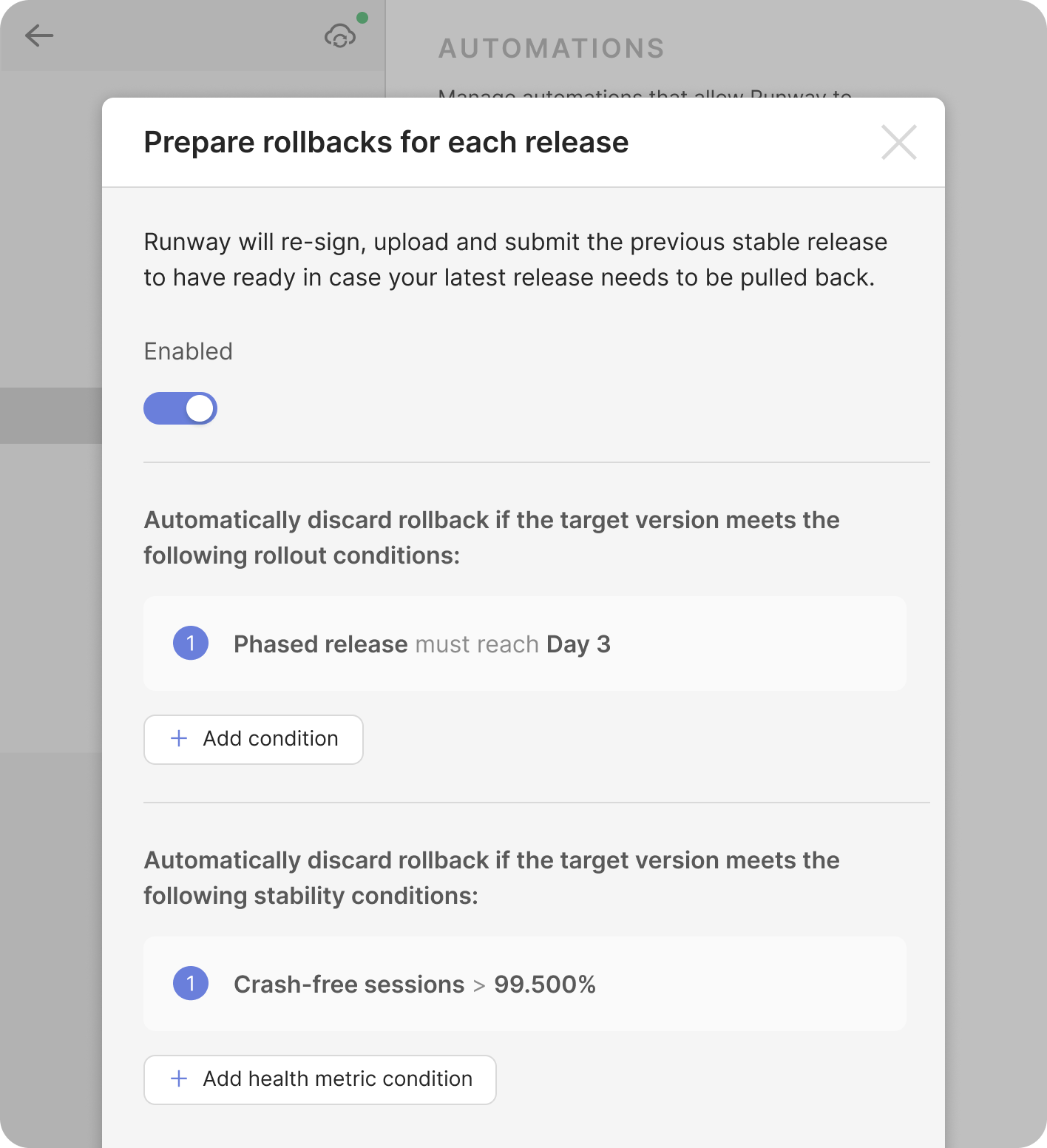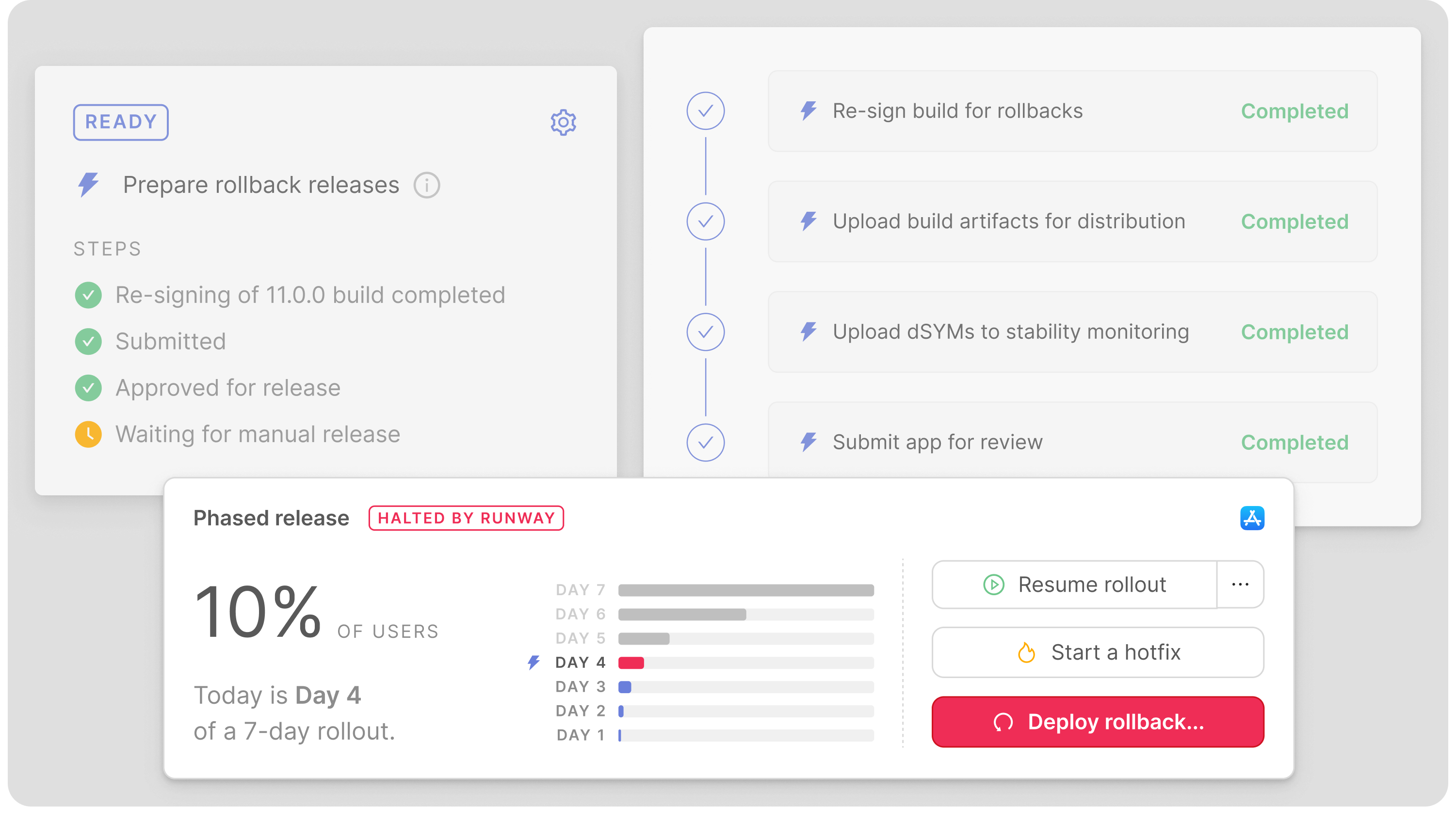 Critical issue? Roll back instantly. In the background of every normal release cycle, Runway automatically re-signs your last live production build and preps it for a possible rollback release — including preemptive submission for review (iOS only) — to remove all possible sources of delay. Should something go wrong in prod, there’s always a corresponding rollback build ready and waiting for single-click release in Runway.