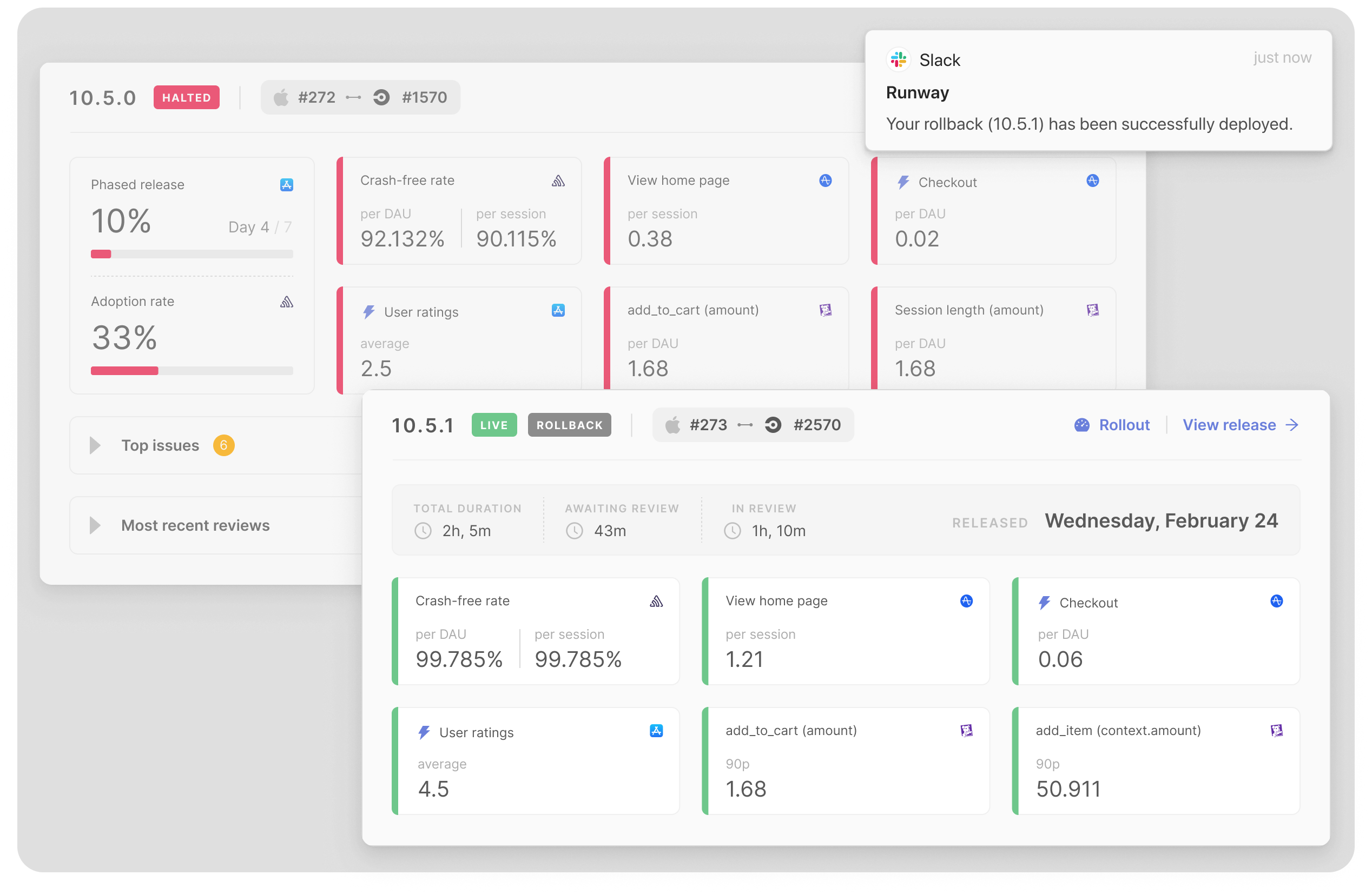 Every team knows the feeling of dread that hits when you’ve shipped a breaking change and leadership shows up in your #mobile Slack channel. Is the fix in yet? Is the build approved by Apple? How about now? With rollbacks in Runway, you can actually respond to these kinds of asks, and give stakeholders confidence that the situation is under control.